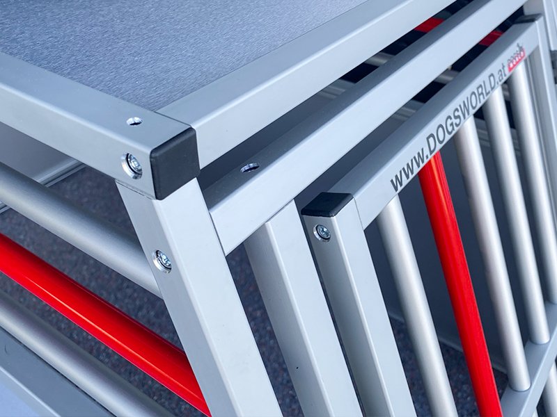 Eloxierte Alubox aus Aluminium-Spezialprofilen, fixiert mit stahlverstärkten PVC-Rundecken und Edelstahlnieten. Boden und Seitenteile bestehen aus Vinylharz-Acrylplatten, was die Box leicht aber dennoch stabil macht. Das heißt, Sie können Ihre Box problemlos nach Bedarf ins bzw. aus dem Auto heben. Außerdem bleiben durch die hohen Seitenteile die Hundehaare in der Box und verteilen sich nicht in Ihrem Auto.